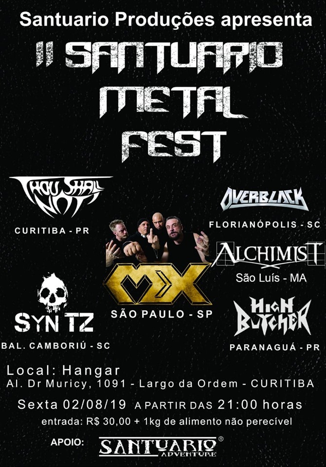 A 2ª edição do Santuário Metal Fest acontece no dia 2 de agosto (sexta-feira) no Hangar – Casa do Ócio. O evento contará com shows das bandas MX (uma das pioneiras do Heavy Metal brasileiro), Thou Shall Not (Curitiba), High Butcher (Paranaguá), Alchimist (Maranhão), Overblack (Blumenau) e Syn TZ (Camboriú).