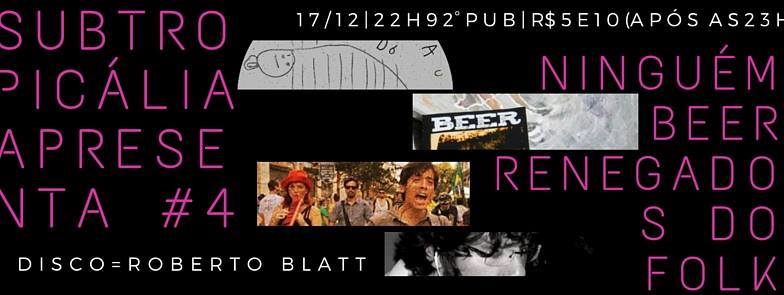 Acontece nesta quinta-feira (17) no 92 Graus a 4ª edição do “Subtropicália apresenta”. O evento terá shows das bandas Ninguém, Beer e Renegados do Folk. A discotecagem será de Roberto Blatt. Os ingressos custam R$ 5 até às 23h e R$ 10 após esse horário. O 92 Graus fica na Av. Manoel Ribas, 108, no Centro.
