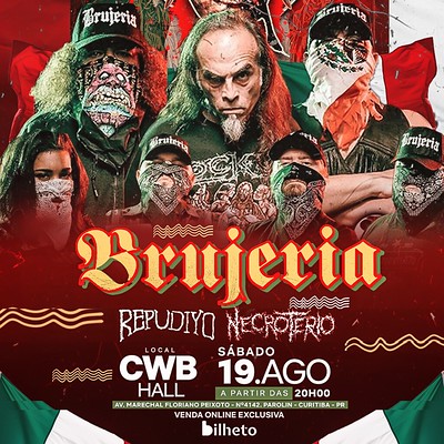 O Brujeria, um dos grandes nomes da história do Deathgrind, se apresenta no dia 19 de agosto (sábado) no Cwb Hall, em Curitiba. A abertura será das bandas curitibanas Necrotério e Repudiyo.