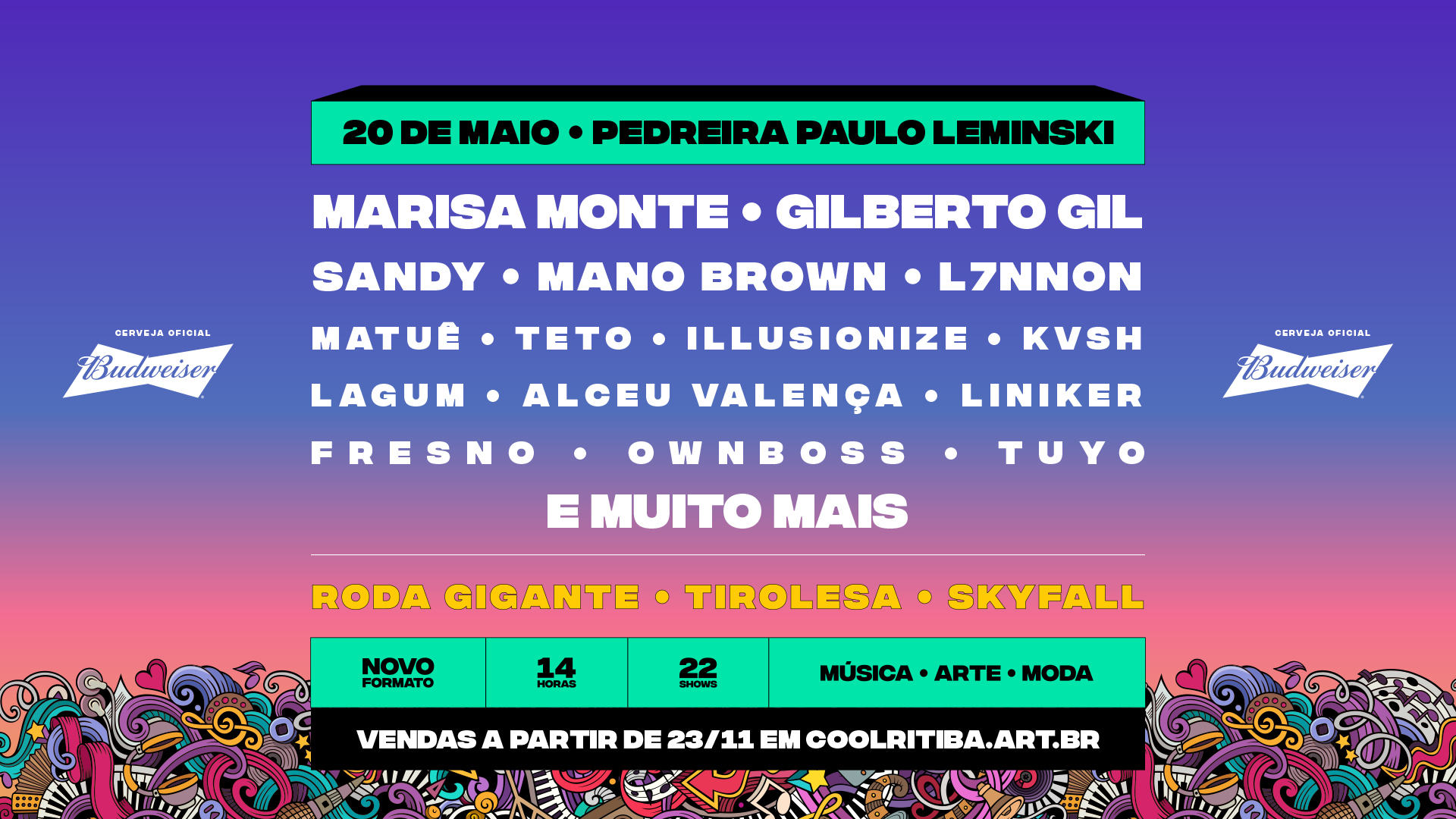 O festival Coolritiba será realizado no dia 20 de maio (sábado), na Pedreira Paulo Leminski, em Curitiba. Neste ano, o evento terá 24 atrações, entre elas, os gigantes da MPB, Gilberto Gil e Marisa Monte.