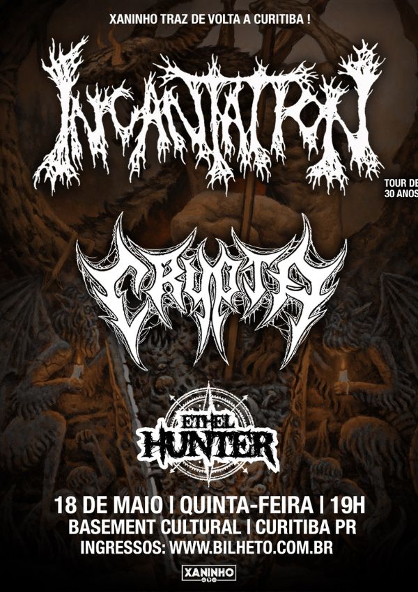 A banda estadunidense Incantation, um dos maiores nomes da história do Death Metal, se apresenta no dia 18 de maio (quinta-feira) no Basement Cultural, em Curitiba. O evento ainda contará com shows das bandas Crypta e Ethel Hunter. A realização é da Xaninho Discos.