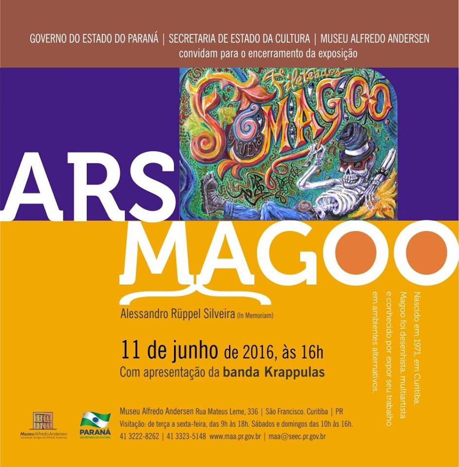Acontece amanhã (11) no Museu Alfredo Andersen a festa de encerramento da Exposição ARS Magoo. O evento começa às 16h e terá uma apresentação da banda curitibana Krappulas. A entrada é franca. O Museu Alfredo Andersen fica na Rua Mateus Leme, 336, no Centro.
