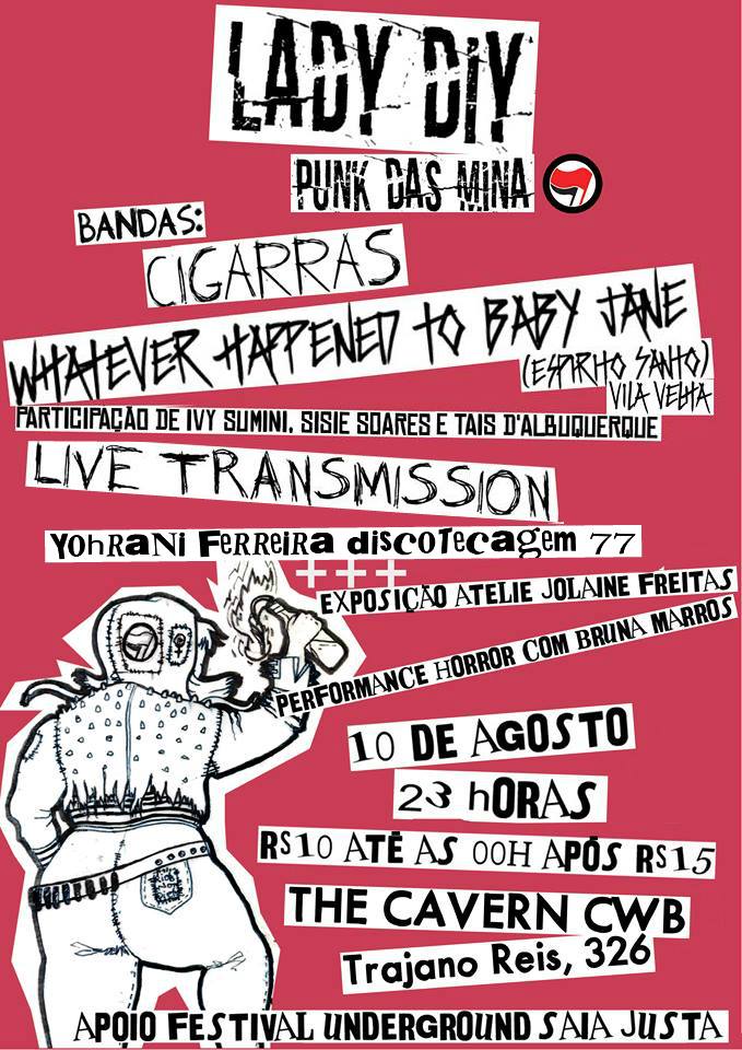 O festival Lady Diy – Punk das Mina será realizado no dia 10 de agosto no The Cavern Club, em Curitiba. O evento contará com shows das bandas Whatever Happened to Baby Jane (Vila Velha – ES), com participação das instrumentistas Taís D’Albuquerque, Ivy Sumini e Sisie Soares, além dos grupos curitibanos Cigarras e Live Transmission.
