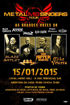 O show Metal Singers Tour acontece nesta quinta-feira (15) no Music Hall, em Curitiba. O supergrupo tem os vocalistas UDO (Accept), Tim Ripper Owens (Judas Priest/Iced Earth), Blaze Bayley (Iron Maiden) e Mike Vescera (Yngwie Malmsteen/Loudness). A programação do show deve ter cada cantor apresentando cinco músicas. No final todos voltam ao palco para uma jam session de clássicos do rock.