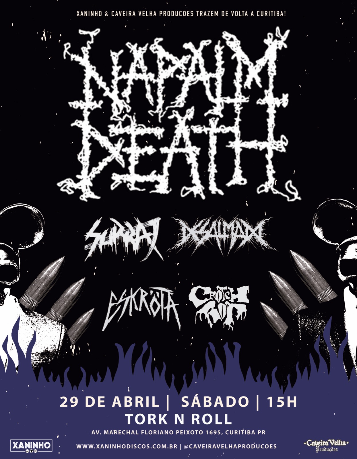 A banda britânica Napalm Death, um dos maiores nomes da história do Death Metal, se apresenta no dia 29 de abril (sábado) no Tork N’ Roll, em Curitiba. O evento ainda contará com shows das bandas Crotchrot, Desalmado, Surra e Eskröta. A realização é da Xaninho e Caveira Velha Produções.