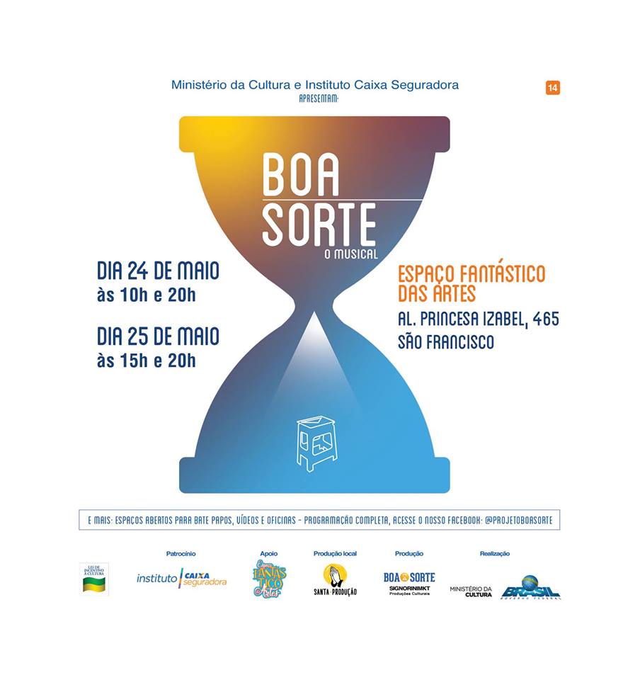 O “Projeto Boa Sorte – O Musical” acontece no dia 24, às 10h e 20h, e no dia 25, às 15h e 20h. A entrada é gratuita. O Espaço Fantástico das Artes fica na Alameda Princesa Izabel, 465, no São Francisco.