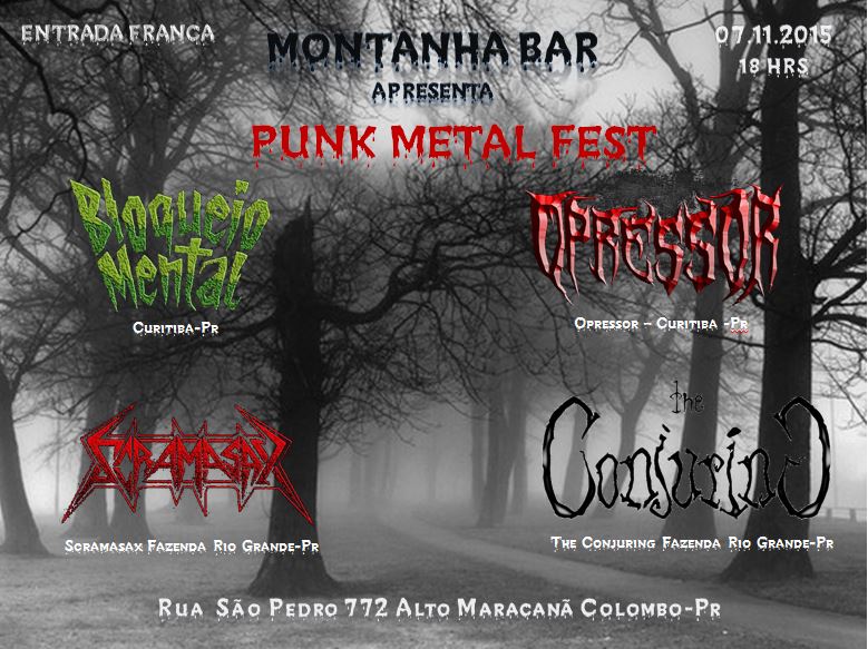 Acontece neste sábado (7) no Montanha Bar, em Colombo, a Punk Metal Fest. O festival terá as bandas Bloqueio Mental, Opressor, Scramasax e The Conjuring. A entrada é franca. As apresentações começam às 18h. O Montanha Bar fica na Rua São Pedro, 772, no bairro Alto Maracanã em Colombo.