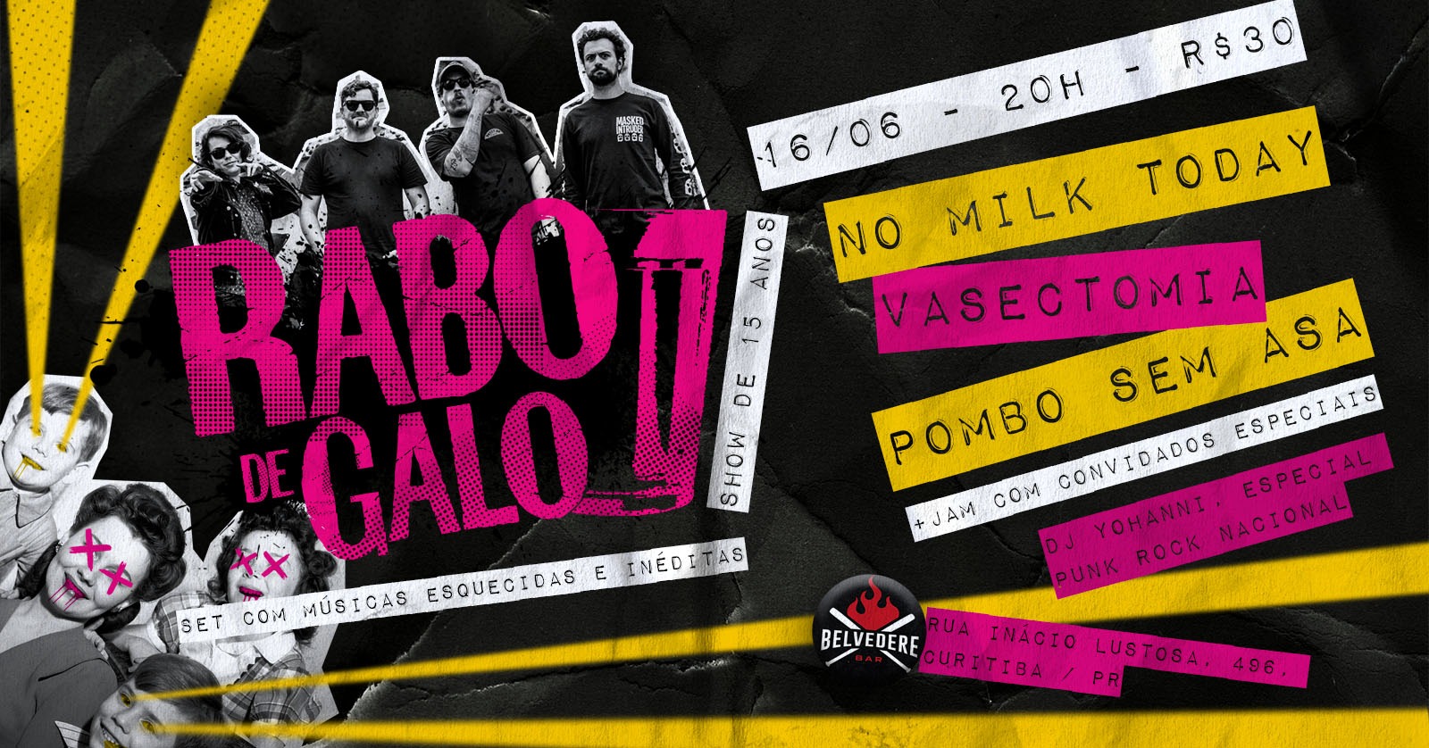 [fusion_widget type=”sfsi_widget” hide_on_mobile=”small-visibility,medium-visibility,large-visibility” class=”” id=”” fusion_display_title=”no” fusion_padding_color=”” fusion_margin=”” fusion_bg_color=”” fusion_bg_radius_size=”” fusion_border_size=”0″ fusion_border_style=”solid” fusion_border_color=”#ff9c3a” fusion_divider_color=”#ff9c3a” fusion_align=”” fusion_align_mobile=”” sfsi_widget__title=”” sfsi_widget__showf=”” /]Em 2023, a banda curitibana Rabo de Galo está comemorando 15 anos de vida dentro do underground brasileiro e a comemoração será em grande estilo. A festa acontecerá no dia 16 de junho (sexta-feira), no Belvedere Bar, em um evento que ainda contará com shows das bandas No Milk Today, Pombo Sem Asa e Vasectomia.