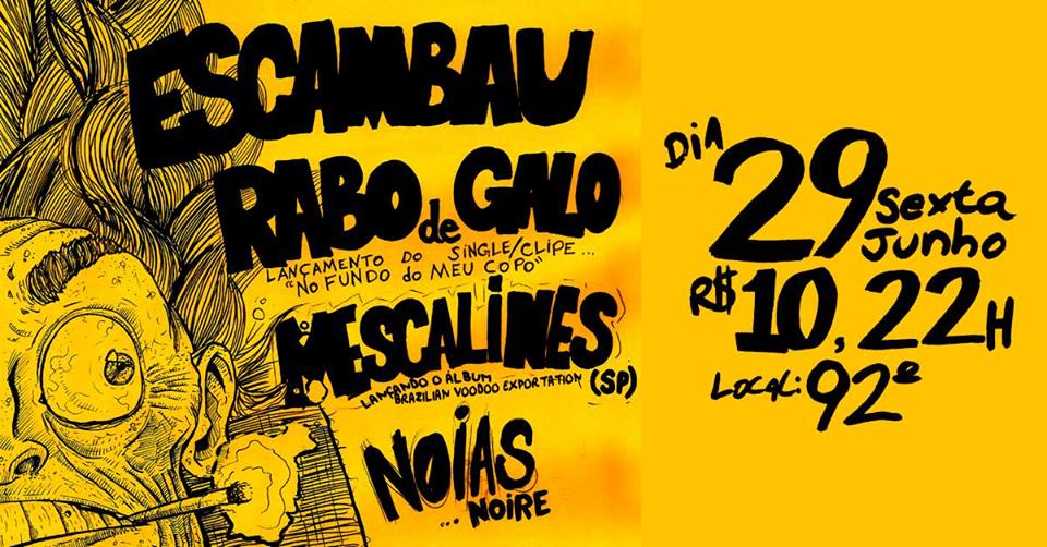 As bandas Rabo de Galo (lançando o single e o clipe “No fundo do meu copo”), Escambau, Mescalines (lançando o álbum “Brazilian Voodoo Exportation) e Noias Noire se apresentam na sexta-feira (29) no 92 Graus. Os ingressos custam R$ 10 e podem ser adquiridos no local.