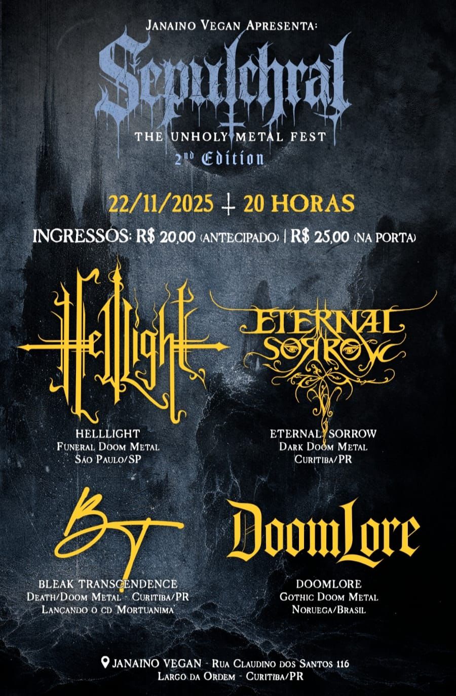Neste sábado (22), o Janaíno Vegan vai receber a 2ª edição do Sepulchral The Unholy Metal Fest. O lineup é composto por quatro das principais bandas do Doom Metal brasileiro: Eternal Sorrow, Helllight, Doomlore e Bleak Transcendence.