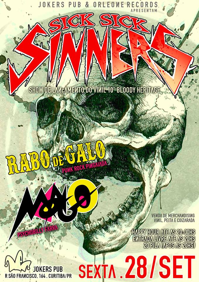 As bandas Sick Sick Sinners, Mongo e Rabo de Galo se apresentam no dia 28 de setembro no Jokers. O show marca o lançamento do vinil 10″ do novo trabalho do Sinners, “Bloody Heritage”. A entrada é gratuita até às 20h. Após esse horário, os ingressos custam R$ 20.