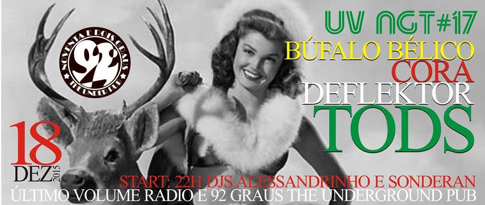 Acontece nesta sexta-feira (18) no 92 Graus a UV Night 17, com as bandas: Tods, Cora, Búfalo Bélico e Deflektor. A discotecagem será de Alessandro Oliveira e Sonderan. Os shows começam às 22h. O 92 Graus fica na Av. Manoel Ribas, 108, no Centro.