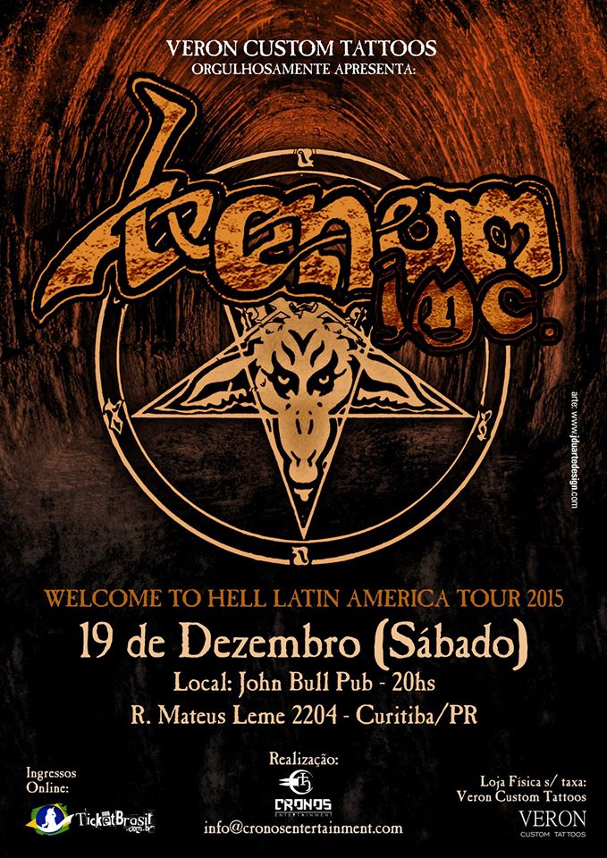 O Venom Inc. se apresenta neste sábado (19) no John Bull Pub. Os ingressos custam R$ 160 (inteira) e R$ 80 (meia-entrada) e podem ser adquiridos no site da Ticket Brasil, na Veron Custom Tattoo (Rua Visconde de Nácar, 940, Centro) e no local do show. A apresentação está prevista para começar às 20h. A censura é de 16 anos. O John Bull Pub fica na Rua Mateus Leme, 2204, no Centro Cívico.
